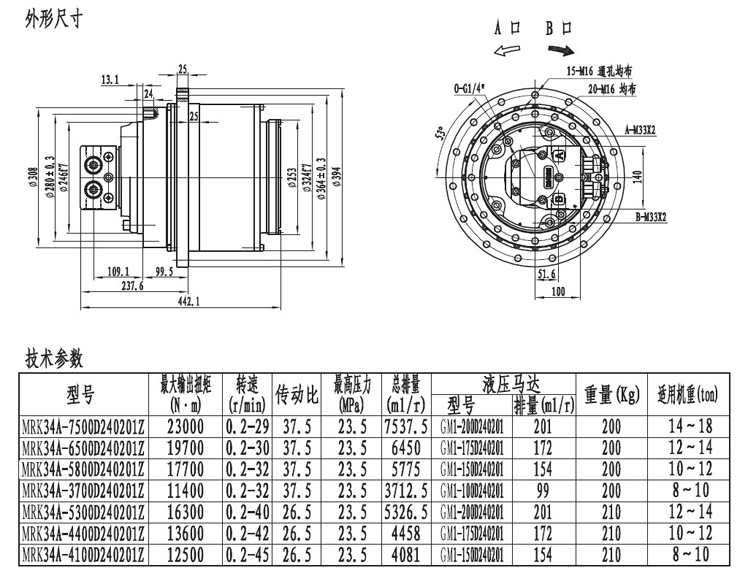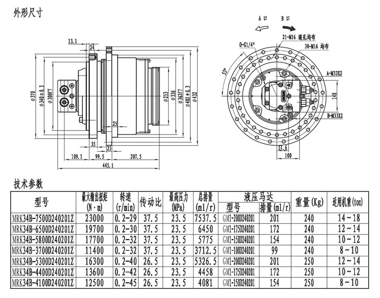 MRK34系列履帶(車輪)用的行走減速機(jī)輸出扭矩在20000NM左右,最低轉(zhuǎn)速能達(dá)到0.2轉(zhuǎn)每分,采用兩級(jí)速比行星齒輪箱傳動(dòng),外形緊湊,機(jī)械通過性極強(qiáng)。